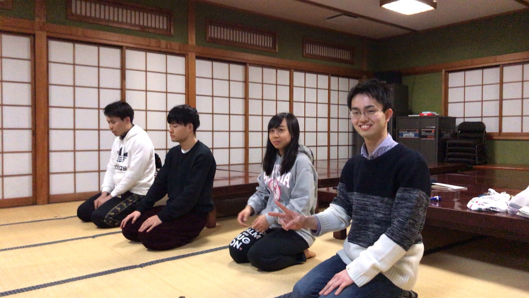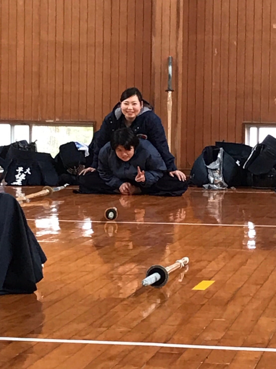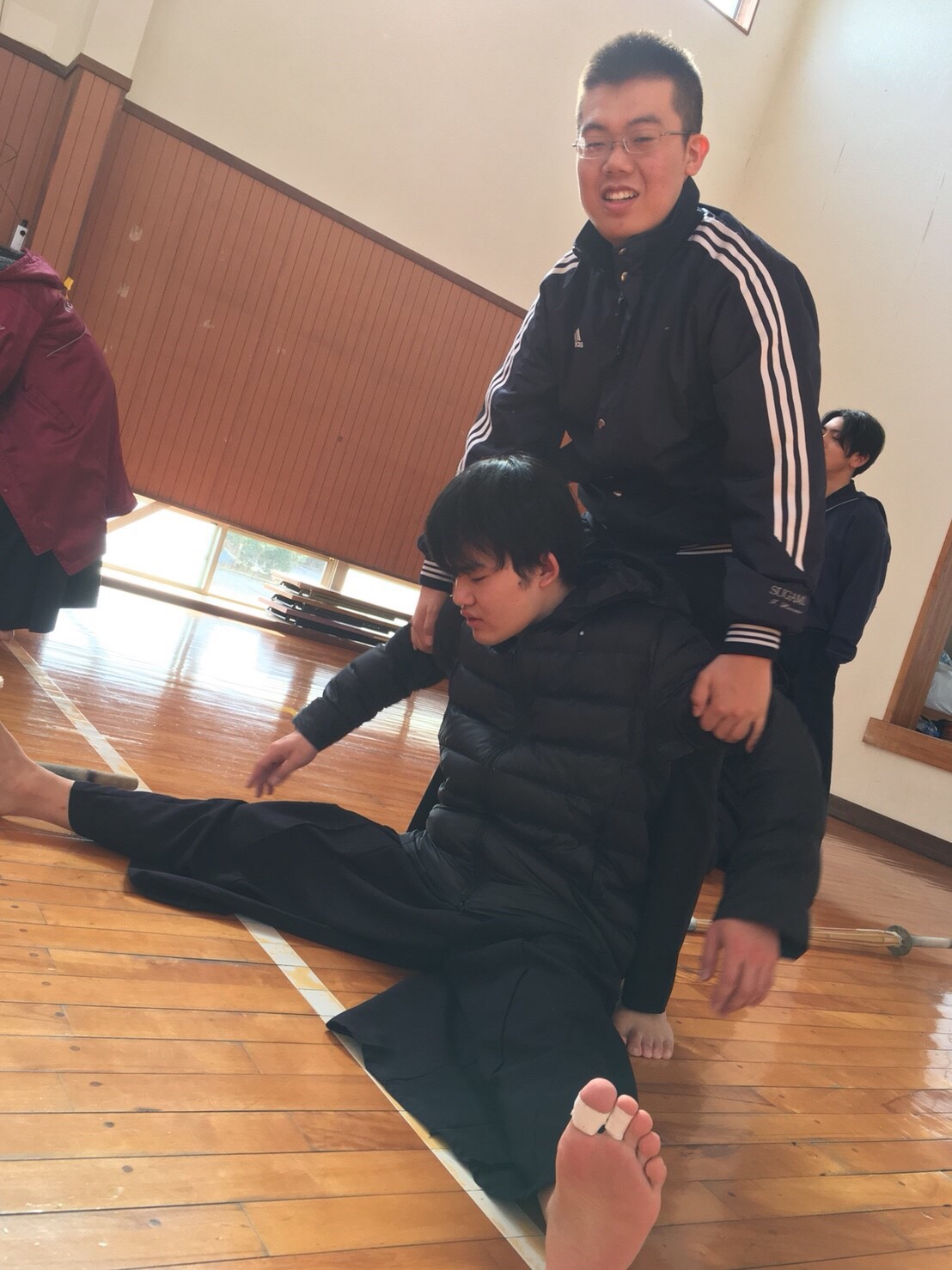 遠くからカメラを発見する女子代と柔軟相手の佐々木