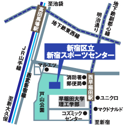 ・練習場所 新宿スポーツセンター4F(右図) 西早稲田キャンパスより徒歩約1分 早稲田・戸山キャンパスより徒歩約20分 JR高田馬場駅より徒歩約10分 ・練習日時 毎週火・木・土曜日の19:00~21:00(20:00~は自由稽古) ・飲み会 毎週土曜日の稽古後21:30~23:00(試合前など例外あり)